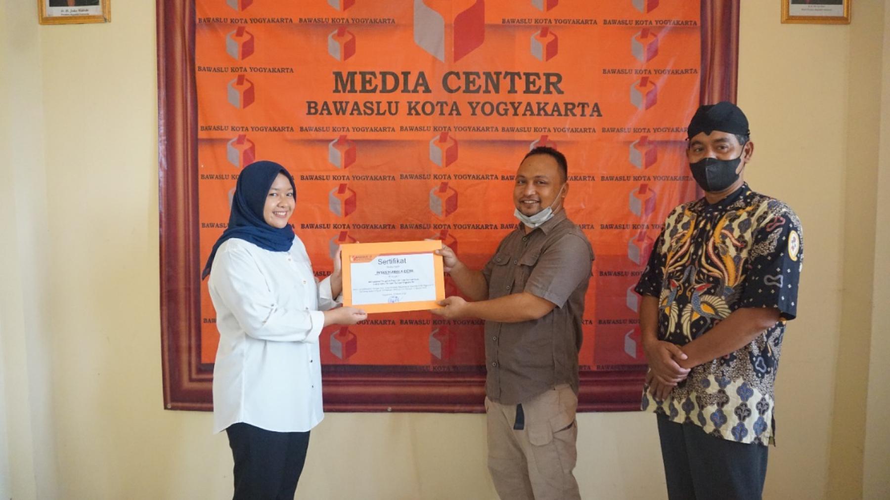Bawaslu Kota Yogyakarta memberikan sertifikat kepada lima Mahasiswa Program Studi Ilmu Komunikasi Universitas Ahmad Dahlan Yogyakarta yang telah melaksanakan Kerja Praktek (Magang) di Bawaslu Kota Yogyakarta.