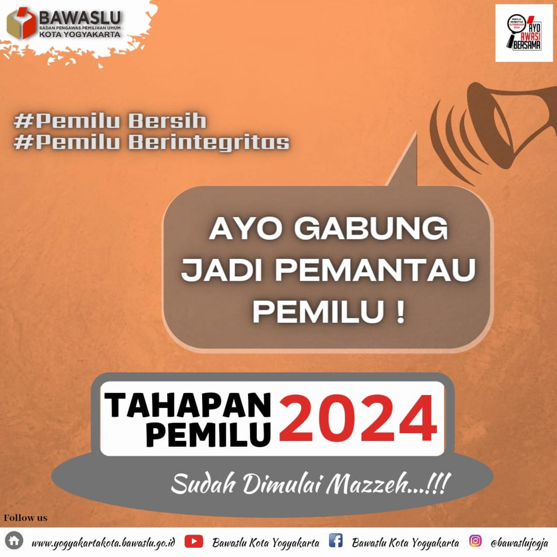 Pendaftaran Pemantau Pemilu humas | Jumat, Juni 17, 2022 - 09:55 Pemilu 2024 sudah dimulai, ayo gabung jadi pemantau Pemilu untuk mewujudkan Pemilu bersih dan berintegritas Tag Pengumuman Share Berita Terkini humas Kamis, November 20, 2025 - 19:19 Bawaslu Kota Yogyakarta Ramaikan Saka Fair, Dorong Generasi Muda Melek Demokrasi humas Kamis, November 20, 2025 - 09:07 Jaga Integritas Pemilu, Bawaslu Kota Yogyakarta Awasi Pelaksanaan Coktas humas Selasa, November 11, 2025 - 09:04 Bawaslu Kota Yogyakarta Canangkan Pembangunan Zona Integritas Menuju WBK/WBBM Lihat Lainnya