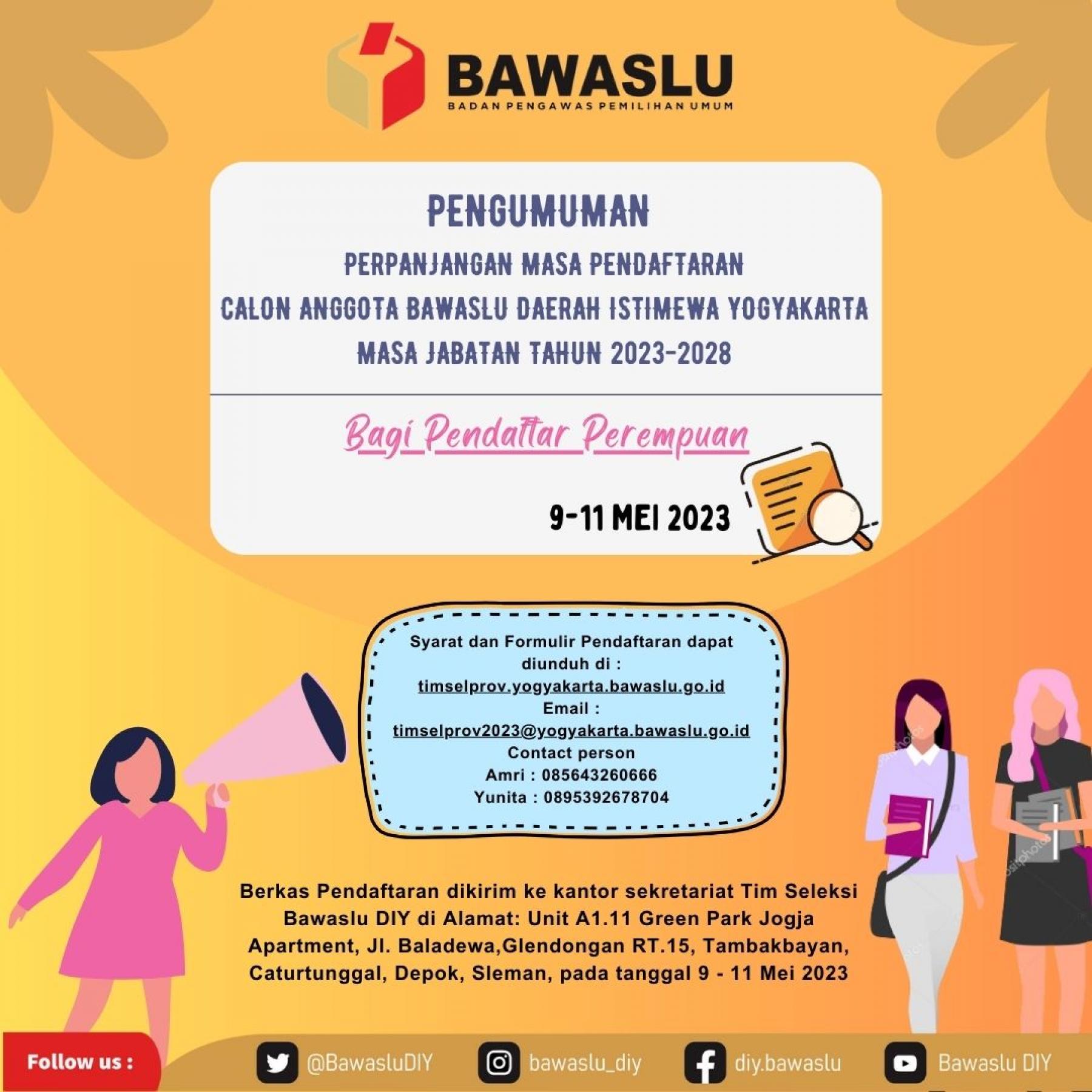 PENGUMUMAN MASA PERPANJANGAN PENDAFTARAN CALON ANGGOTA BAWASLU DAERAH ISTIMEWA YOGYAKARTA MASA JABATAN TAHUN 2023-2028 BAGI PENDAFTAR PEREMPUAN humas | Senin, Mei 8, 2023 - 12:38 Klik Pengumuman Masa Perpanjangan Pendaftaran Calon Anggota Bawaslu DIY Bagi Pendaftar Perempuan Tag Pengumuman Share Berita Terkini humas Kamis, November 20, 2025 - 19:19 Bawaslu Kota Yogyakarta Ramaikan Saka Fair, Dorong Generasi Muda Melek Demokrasi humas Kamis, November 20, 2025 - 09:07 Jaga Integritas Pemilu, Bawaslu Kota Yogyakarta Awasi Pelaksanaan Coktas humas Selasa, November 11, 2025 - 09:04 Bawaslu Kota Yogyakarta Canangkan Pembangunan Zona Integritas Menuju WBK/WBBM Lihat Lainnya