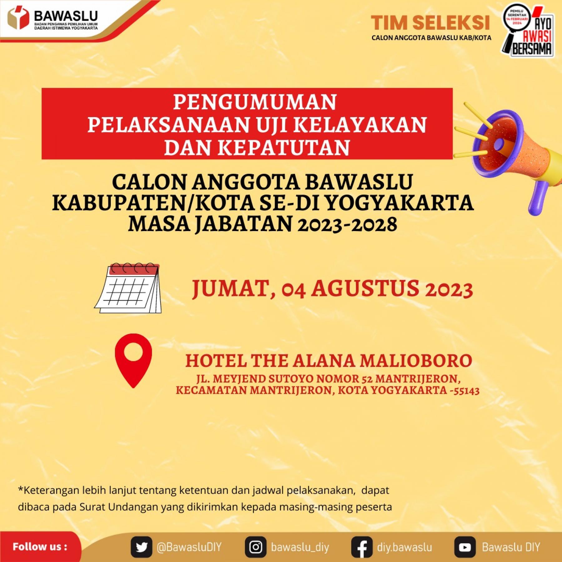 Pengumuman Pelaksanaan Uji Kelayakan dan Kepatukan Calon Anggota Bawaslu Kabupaten/Kota se D.I Yogyakarta Masa Jabatan 2023-2028 humas | Rabu, Agustus 2, 2023 - 16:25 Pengumuman Pelaksanaan Uji Kelayakan dan Kepatukan Calon Anggota Bawaslu Kabupaten/Kota se D.I Yogyakarta Masa Jabatan 2023-2028 Tag Pengumuman Share Berita Terkini humas Kamis, November 20, 2025 - 19:19 Bawaslu Kota Yogyakarta Ramaikan Saka Fair, Dorong Generasi Muda Melek Demokrasi humas Kamis, November 20, 2025 - 09:07 Jaga Integritas Pemilu, Bawaslu Kota Yogyakarta Awasi Pelaksanaan Coktas humas Selasa, November 11, 2025 - 09:04 Bawaslu Kota Yogyakarta Canangkan Pembangunan Zona Integritas Menuju WBK/WBBM Lihat Lainnya