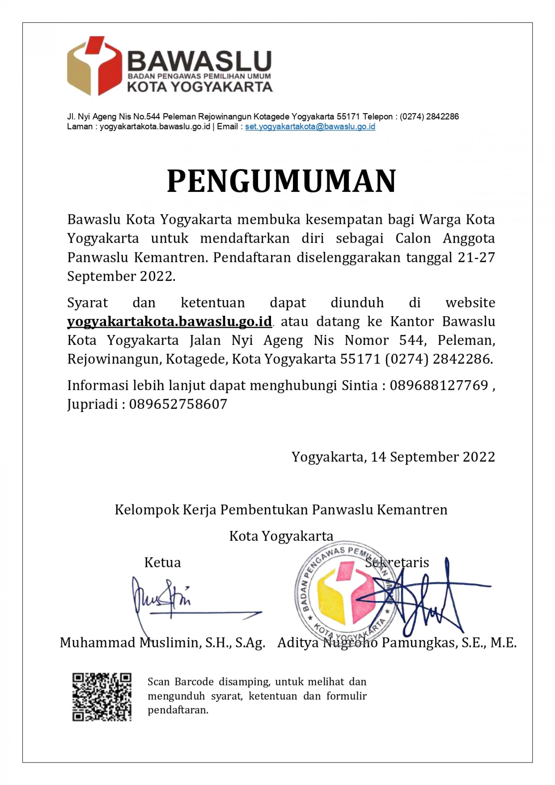 Pengumuman Pendaftaran Calon Anggota Panwaslu Kemantren Kota Yogyakarta Tahun 2022