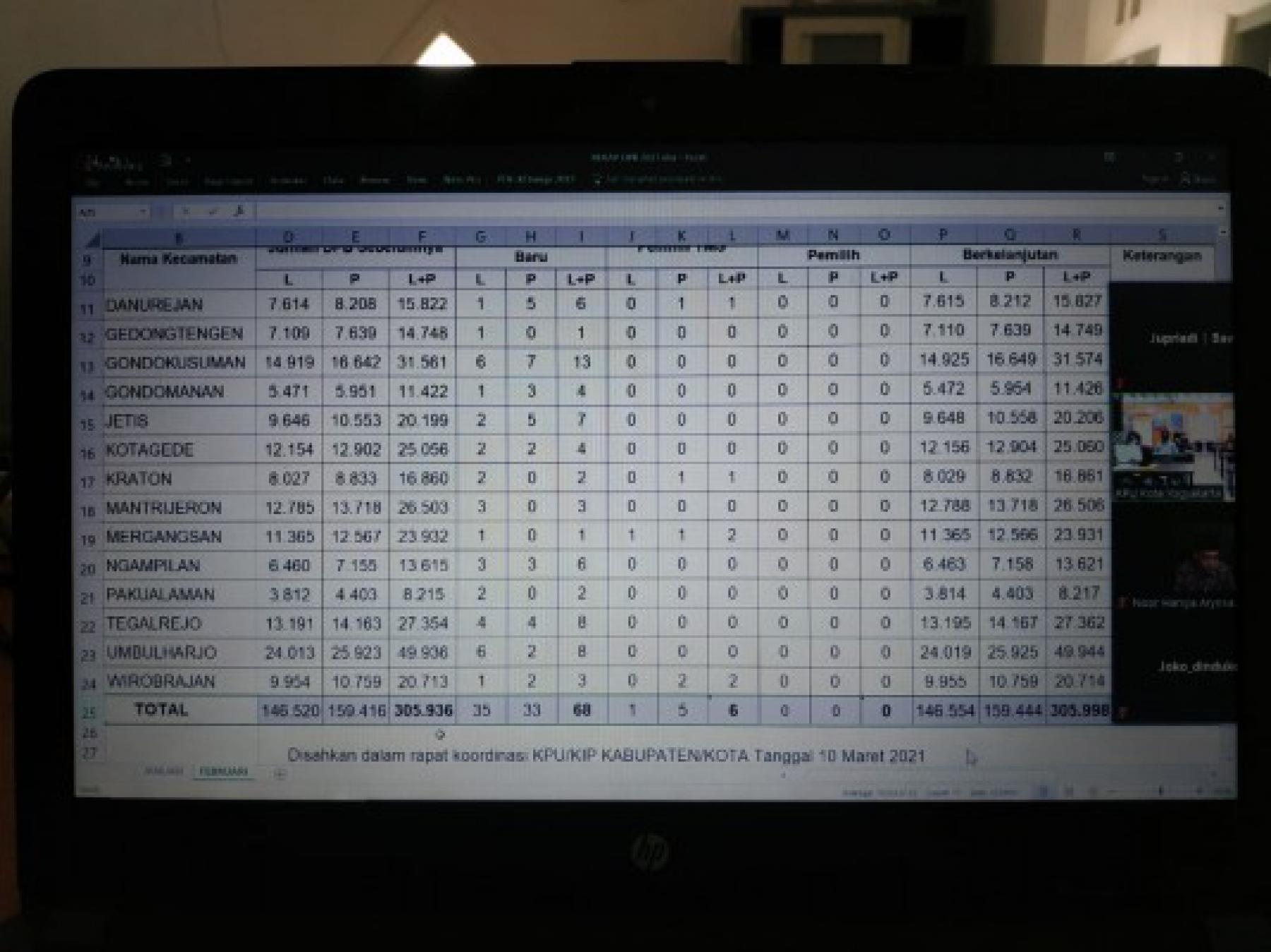 Pada Hari Rabu, 10 Maret 2021 Pukul 13.00 KPU Kota Yogyakarta melaksanakan Rapat Koordinasi Pemuktahiran Daftar Pemilih Berkelanjutan Periode Bulan Februari 2021 melalui Zoom Meeting yang dihadiri Ketua dan Anggota Bawaslu Kota Yogyakarta, Staf PHHL dan HPPS Bawaslu Kota Yogyakarta serta Dinas Kependudukan dan Pencatatan Sipil Kota Yogyakarta