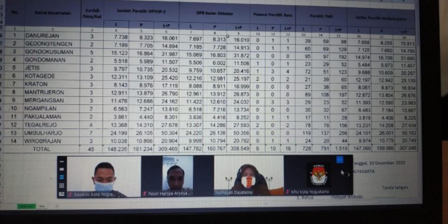 Divisi Data Ibu Siti Nurhayati menyampaikan jumlah potendi pemilih baru yakni laki-laki 6 orang dan perempuan 10 orang sehingga jumlah total laki-laki dan perempuan 16 orang. Adapun jumlah tidak memenuhi syarat (TMS) sejumlah 728 0rang laki-laki dan 791 perempuan sehingga total TMS 1.519 orang. Pada periode November 2020 jumlah total Daftar Pemilih Berkelanjutan untuk wilayah Kota Yogyakarta sebesar 307.046 orang dengan rincian laki-laki 147.060 orang dan perempuan 159.986.