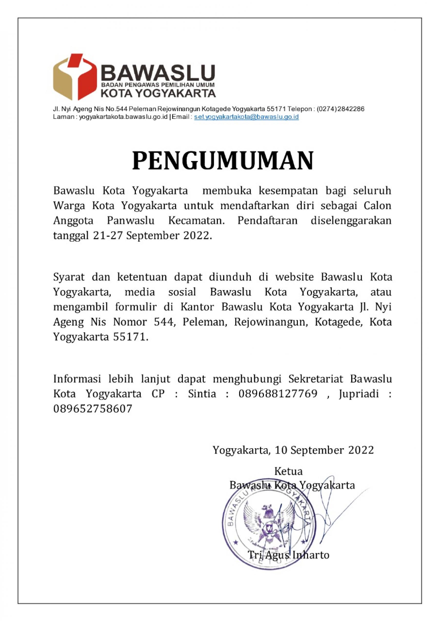 Syarat dan Ketentuan Pendaftaran Calon Anggota Panwaslu Kecamatan Tahun 2022 dapat di unduh di laman : https://ppid.yogyakartakota.bawaslu.go.id/main/front/files/file_910_SYARAT%20DAN%20KETENTUAN%20PENDAFTARAN%20PANWASLUCAM%202022.pdf